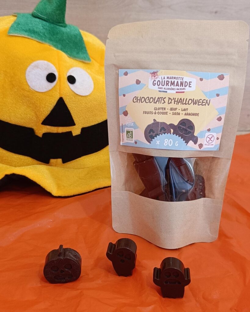 La Marmotte Gourmande est fière de vous présenter sa nouvelle création gourmande : des chocolats sans lait sans fruits à coque sans gluten, et sans aucun autre allergène pour fêter Halloween avec gourmandise !
