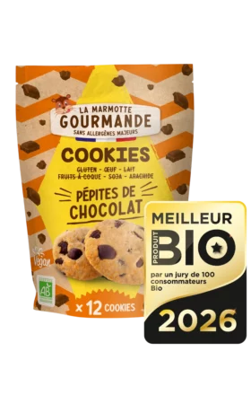 Nos cookies pépites de chocolat sans gluten, vegan et sans allergènes majeurs, ont obtenu le label “Meilleur Produit Bio 2026”.